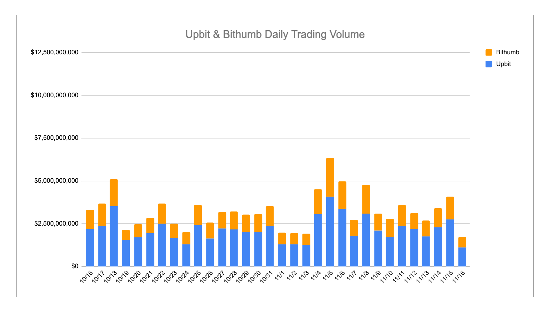 Daily trading volume analysis shows that Upbit consistently contributed the majority of combined volume across the week, with peaks observed around 11/16. Bithumb’s volume, while lower than Upbit on most days, spiked notably in mid-week, reflecting increased market activity on certain days. Overall, the total daily volumes indicate a steady level of trading engagement, with occasional surges likely driven by high-volume transactions in the top cryptocurrencies.