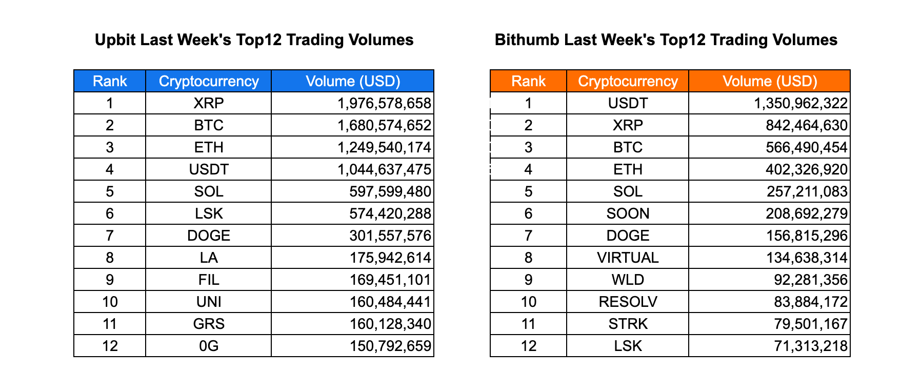 Last week, Upbit recorded XRP as the top traded cryptocurrency with a volume of $1.98 billion, followed by BTC at $1.68 billion and ETH at $1.25 billion. USDT and SOL also maintained significant trading activity, with volumes exceeding $1 billion and $597 million, respectively. On Bithumb, USDT led the trading volumes at $1.35 billion, while XRP and BTC followed with $842 million and $566 million, respectively. ETH and SOL also showed notable activity with $402 million and $257 million in trading volumes.