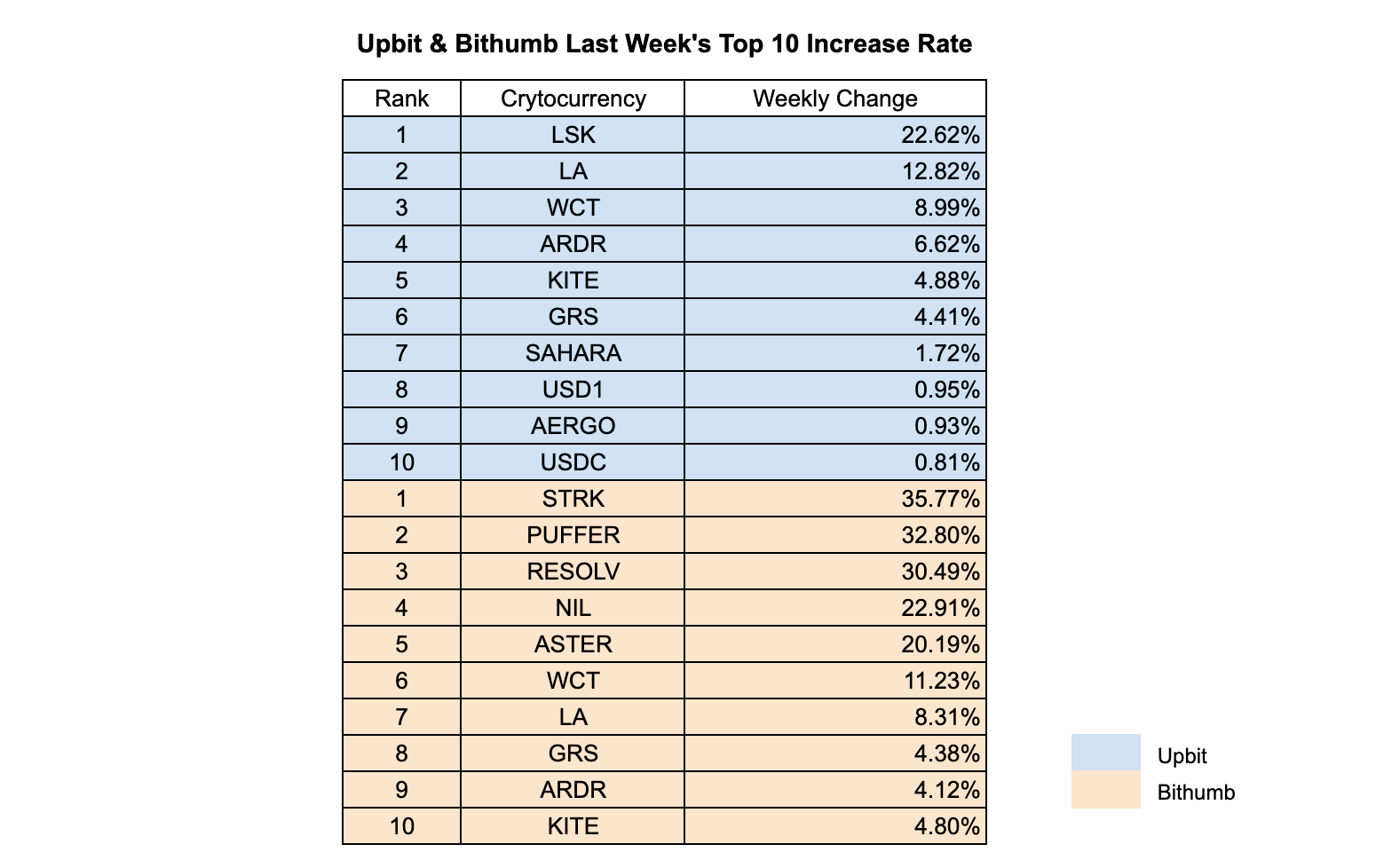 Overall, LSK, STRK, and PUFFER emerged as the most noteworthy performers across the two exchanges, with WCT and LA maintaining consistent presence in both top 10 lists. The week reflected selective optimism in smaller-cap projects, while larger-cap stablecoins and utility tokens remained relatively steady.
