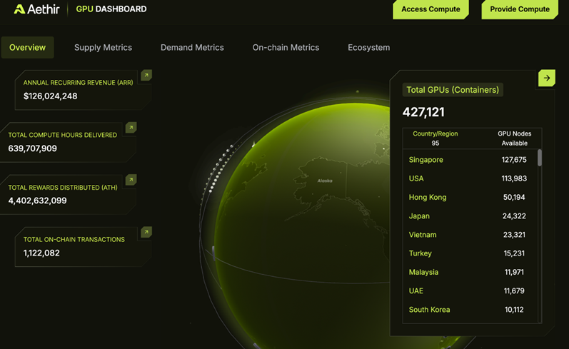 이러한 격차를 해소하고자 에이셔(Aethir)는 전 세계에 흩어진 유휴 GPU 리소스를 모아 하나의 거대한 연산 풀을 형성하고, 이를 온디맨드 클라우드 서비스 형태로 제공하고 있다. 에이셔의 탈중앙화 물리 인프라 네트워크(DePIN, Decentralized Physical Infrastructure Network)는 전 세계 400,000개 이상의 엔터프라이즈급 GPU를 모아 거대한 93개 이상의 거점에 분산 배치해 하나의 통합 네트워크로 운영하며, 해당 거대 GPU팜에서 누구나 사용한 만큼만 비용을 지불하고 접근할 수 있도록 설계되었다.