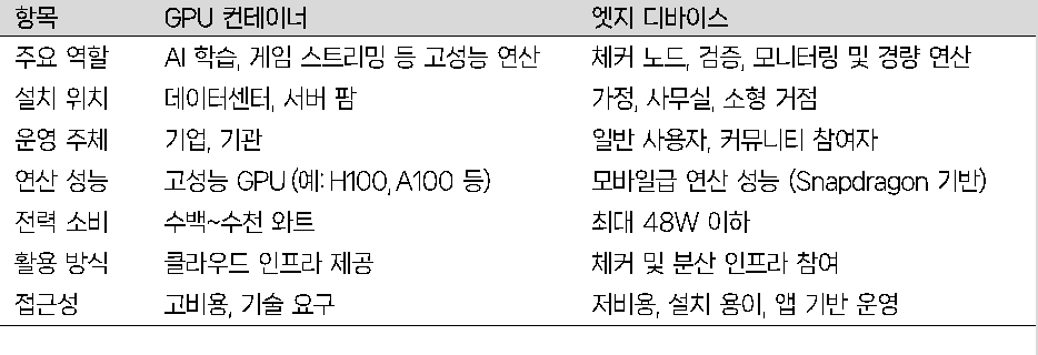 GPU 공급자는 일반적으로 데이터센터, 마이닝 팜, 고성능 컴퓨팅 클러스터 등 기관 중심의 인프라 사업자로 구성되어 있다. 하지만 모든 연산 작업이 반드시 고성능 GPU를 필요로 하는 것은 아니며, 검증, 모니터링, 경량 연산 등 다양한 작업은 저전력 장비로도 충분히 처리할 수 있다. 에이셔는 이러한 수요를 충족하기 위해 개인이나 소규모 참여자도 손쉽게 네트워크에 참여할 수 있도록 '엣지(Edge) 디바이스'를 설계했다.