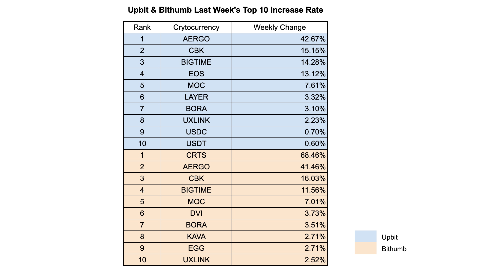 Despite the relatively low market momentum, a handful of tokens managed to generate significant weekly returns, especially AERGO and CBK, which ranked in the top three across both exchanges.