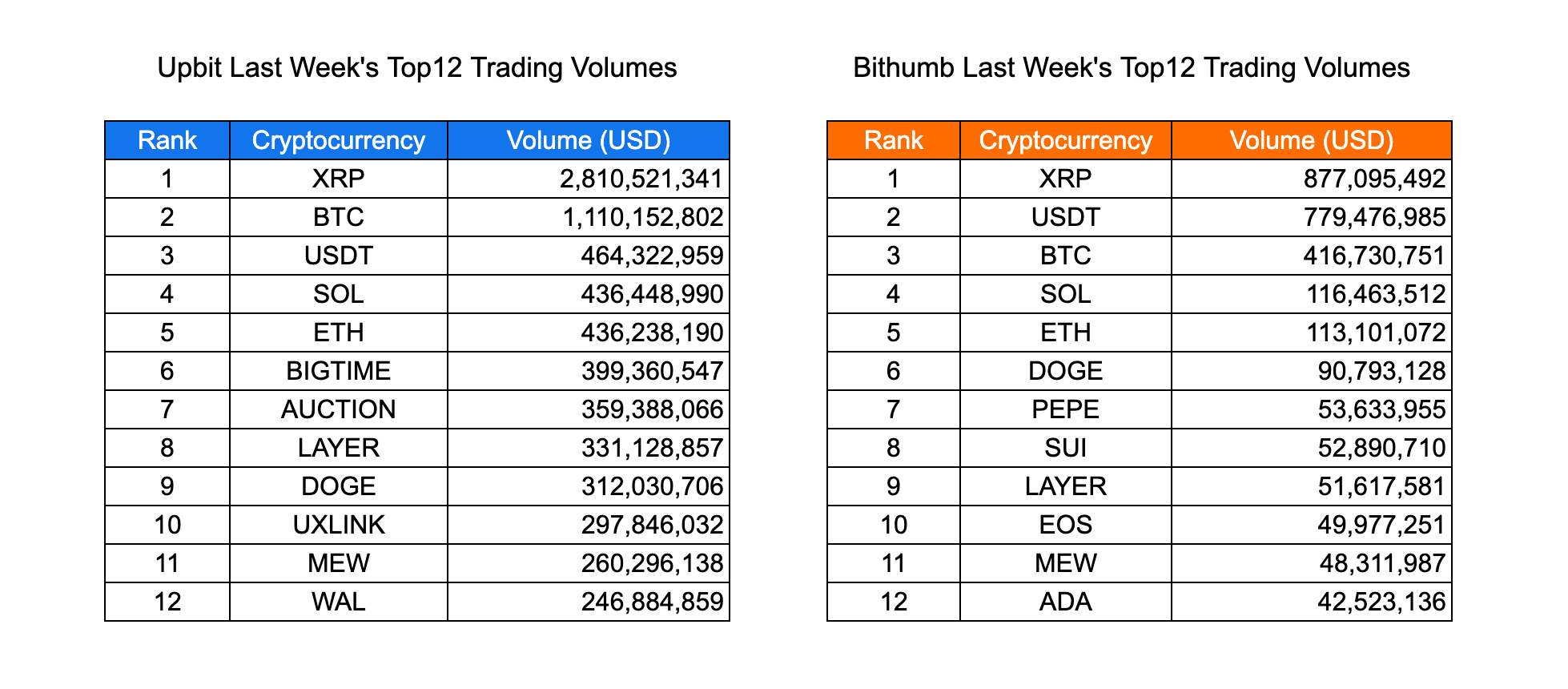 Despite this activity, overall trading remains subdued, with most other tokens generating significantly lower volume. For example, coins like PEPE, SUI, LAYER, and MEW recorded modest figures ranging from $48 million to $54 million on Upbit, while BIGTIME, AUCTION, and UXLINK ranged between $297 million and $399 million on Bithumb.