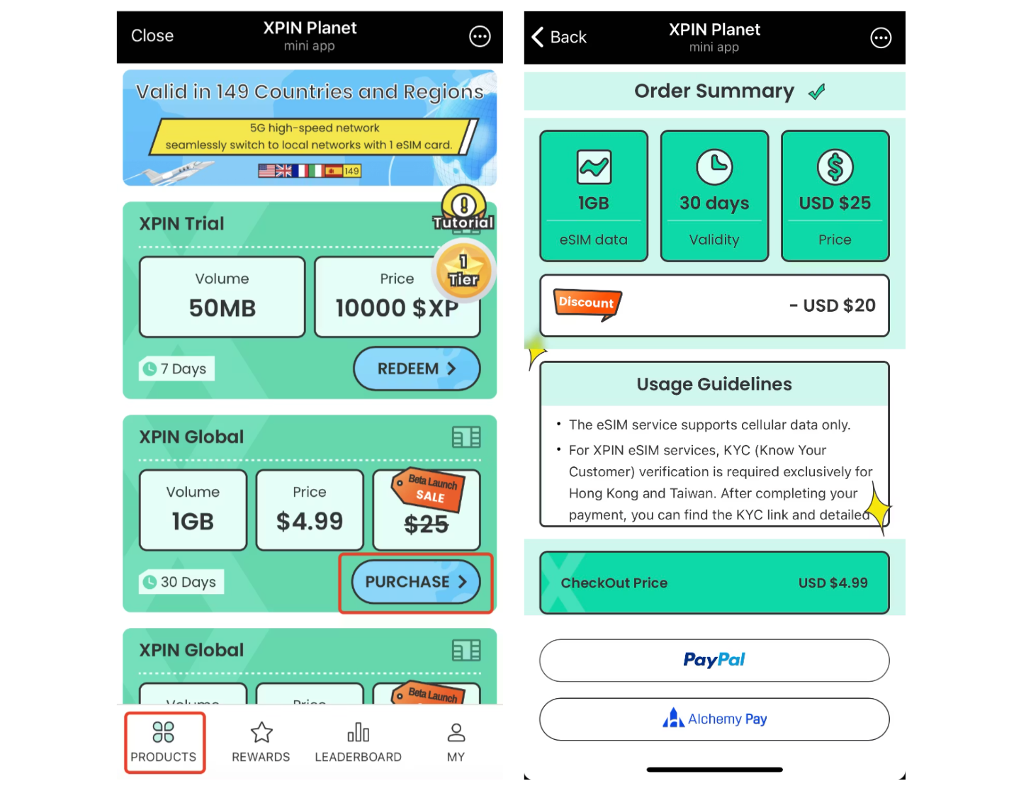 엑스핀 네트워크에서 사용자 참여를 유도하기 위한 선택한 전략은 텔레그램 미니 앱이다. 이 앱은 eSIM 플랜 구매부터 데이터 사용량 확인, 보상 획득까지 모든 과정을 간단한 UI 안에서 제공한다. 엑스핀은 여기에 레벨업 시스템, 미션 완료 보상 등 게임화 요소를 결합해 사용자의 반복 참여를 유도하고 있다.