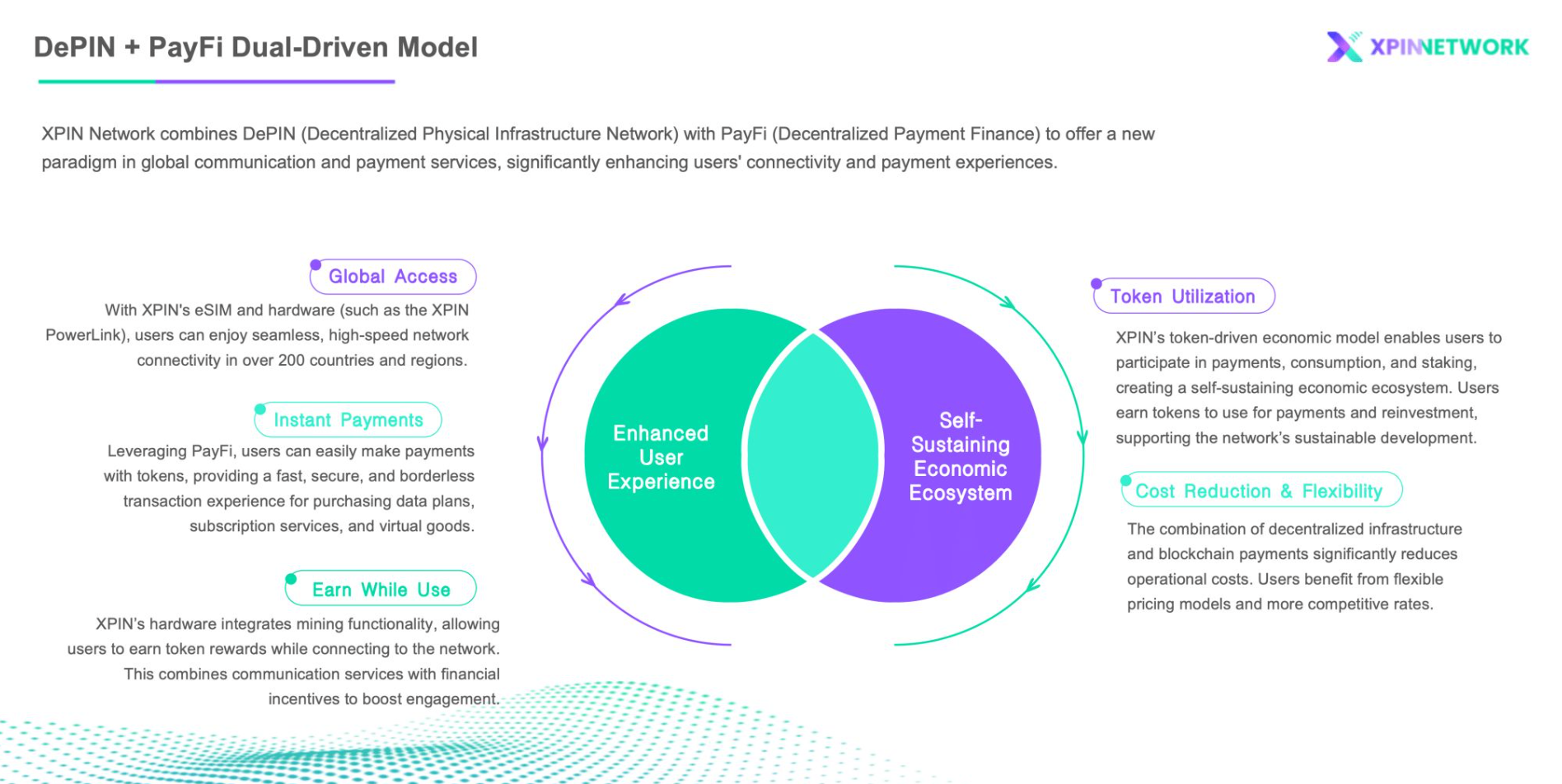 예를들어, XPIN의 대표 하드웨어인 PowerLink를 통해 사용자는 글로벌 네트워크에 연결되고, 동시에 해당 사용 내역이 자동으로 마이닝 기능과 연계되어 $XPIN 토큰으로 보상을 받는다. 이는 기존 로밍 서비스의 중개 비용을 줄이는 동시에, 사용자의 기여도를 실시간으로 보상하는 새로운 접근 방식이다. 이와 같은 토큰 구조는 단기 보상을 넘어 장기적인 네트워크 운영을 가능하게 하는 기반이 된다. 엑스핀 네트워크를 통한 PayFi는 단순한 결제 시스템이 아니라, 디핀 기반 인프라 운영에 실질적인 인센티브를 부여하는 경제 구조로 기능한다고 볼 수 있다.