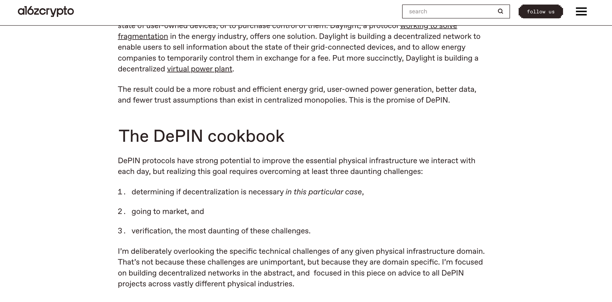 a16z의 파트너 Guy Wuollet이 작성한 보고서 ‘Why DePIN Matters, and how to make it work’에 따르면, ‘디핀은 물리적 인프라를 탈중앙화함으로써 더 공정하고 효율적인 사회를 만들 수 있는 열쇠’다. 다만 “전력, 통신, 라이드셰어, 인터넷 등 기존 시스템은 강력한 네트워크 효과와 규제 보호를 갖추고 있어 진입장벽이 높기 때문에, 기존 시스템과 어떻게 연결될지, 어디에서 가치를 줄 수 있을지를 먼저 고민해야 한다”고 강조했다.