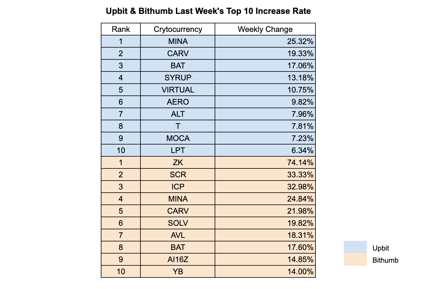 Upbit’s top performers were led by MINA (+25.32%) and CARV (+19.33%), followed by BAT (+17.06%) and SYRUP (+13.18%), showing strength in infrastructure and data-related tokens. VIRTUAL (+10.75%) and AERO (+9.82%) also gained traction, reflecting investor interest in project-based ecosystems. On Bithumb, strong surges were observed in ZK (+74.14%) and SCR (+33.33%), both within the ZK and AI narrative sectors, indicating thematic trading dominance. ICP (+32.98%) and MINA (+24.84%) followed closely, suggesting renewed interest in layer and privacy-focused assets. CARV, which performed well on both exchanges, stood out as one of the week’s few dual-market gainers. Overall, momentum concentrated around privacy, infrastructure, and data-layer narratives, signaling a continued shift toward projects underpinning decentralized identity and scalability solutions.