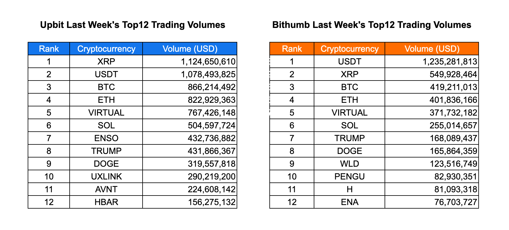 The Korean crypto market saw steady but slightly subdued activity last week. Upbit’s activity peaked between October 10–11, driven by retail participation in major assets, while Bithumb showed a more consistent pace. On Upbit, XRP ($1.12B) remained the top-traded token, followed by USDT ($1.07B), BTC ($866M), and ETH ($823M), reflecting stable investor preference for blue-chip assets. Meanwhile, speculative names such as VIRTUAL, TRUMP, and ENSO drew notable trading interest, signaling that retail traders are still active despite lower overall liquidity. On Bithumb, USDT ($1.23B) led volumes, followed by XRP, BTC, and ETH, showing similar large-cap concentration but with smaller overall turnover compared to Upbit.