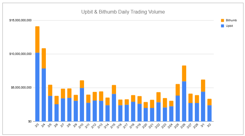 The Korean cryptocurrency market from February 24 to March 3 showed significant activity with several new listings and notable market movements driven largely by Trump-related news. During this period, Upbit listed Cow Protocol (COW), while Bithumb introduced Ethena (ENA) and MyShell ($SHELL). The combined weekly trading volume between Upbit and Bithumb reached 35 billion, with Upbit accounting for 24.3 billion and Bithumb for 10.2 billion, showing an increase from the previous week's trading volume.