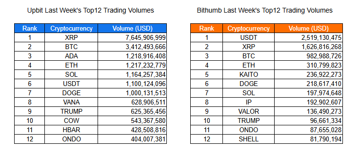 Comparing Upbit and Bithumb data, XRP dominates Korean exchange volume while USDT shows high liquidity on Bithumb, with Trump-related assets (TRUMP, HBAR) and established tokens (BTC, ETH, SOL) maintaining strong investor interest across both major exchanges, reflecting a market balancing between speculation and stability.