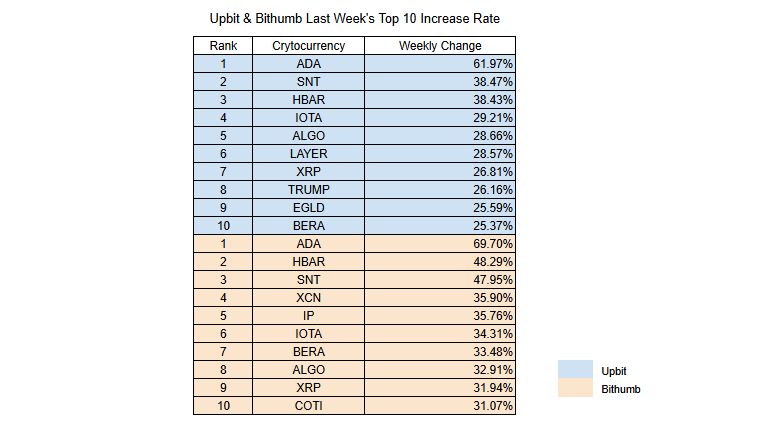 The week's standout performer was Cardano (ADA), which surged 62% on Upbit and nearly 70% on Bithumb after being included in former President Trump's 'Crypto Strategic Reserve' plan. Similarly, Hedera (HBAR) recorded the second-highest returns on both exchanges, benefiting from Trump-related positive sentiment as it's classified in the enterprise blockchain sector. Other notable gainers included Status Network Token (SNT), IOTA (IOTA), and Algorand ($ALGO).