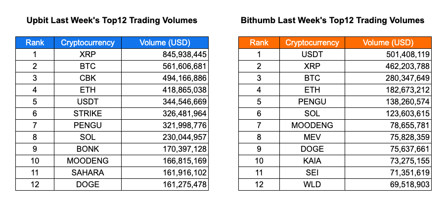 This week, Korean crypto trading saw strong interest in both major tokens and speculative mid-caps. On Upbit, XRP, BTC, and CBK led volumes, while memecoins like MOODENG and BONK showed notable activity. Bithumb mirrored these trends, with rising retail attention on PENGU, MEV, and other niche assets. Top gainers included CBK, BONK, and STRIKE, all posting 50%+ weekly gains, highlighting a continued appetite for high-risk, high-reward plays across Korean exchanges.