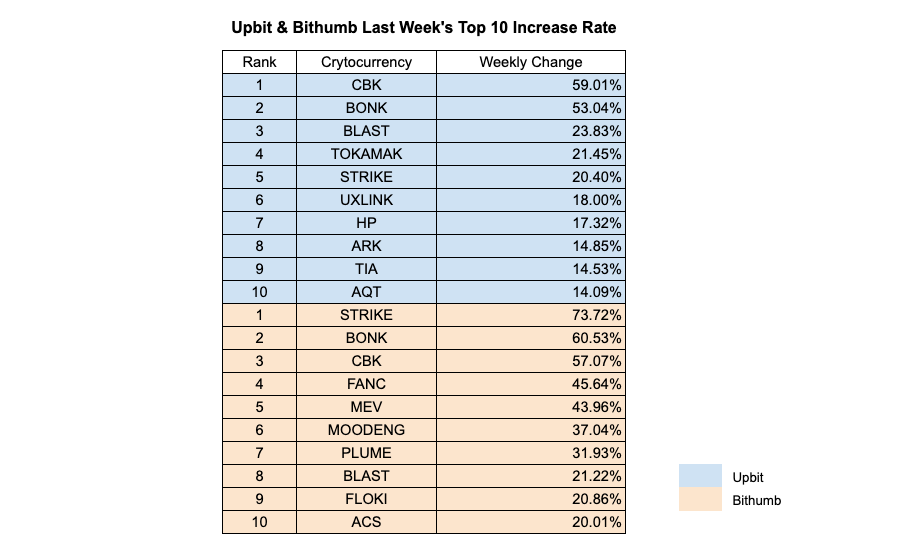 This week’s top gainers on Upbit were dominated by high-volatility tokens, led by CBK with a 59.01% weekly gain, followed closely by BONK at 53.04%. BLAST (+23.83%), TOKAMAK (+21.45%), and STRIKE (+20.40%) also saw double-digit growth, highlighting momentum in both memecoins and lesser-known infrastructure projects. Notably, UXLINK, HP, and ARK each gained between 14% and 18%, signaling renewed interest in mid-cap tokens. The appearance of TIA and AQT among the top 10 suggests a broadening of trader attention beyond short-term narratives.